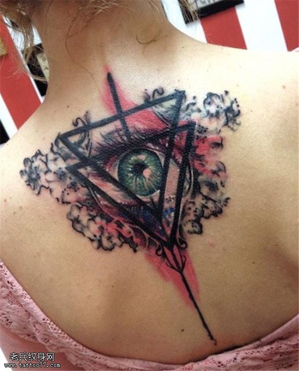 女生背部彩色泼墨眼睛纹身图案