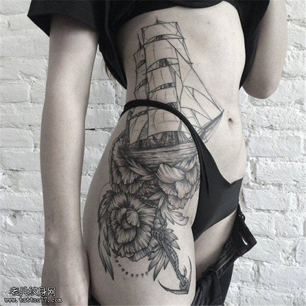 女生侧腰帆船玫瑰花纹身图案