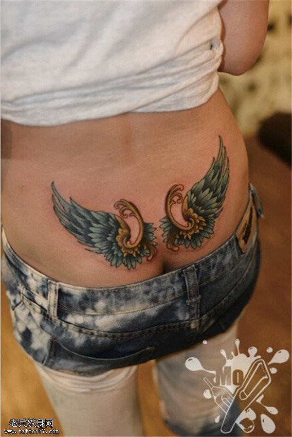 腰部彩色翅膀纹身图案