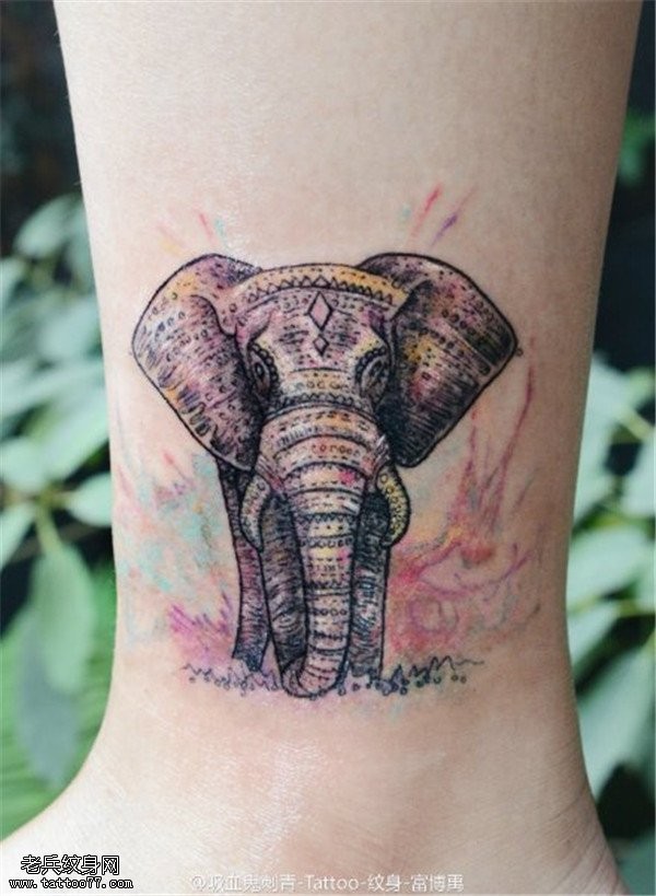 脚踝彩色写实象纹身图案
