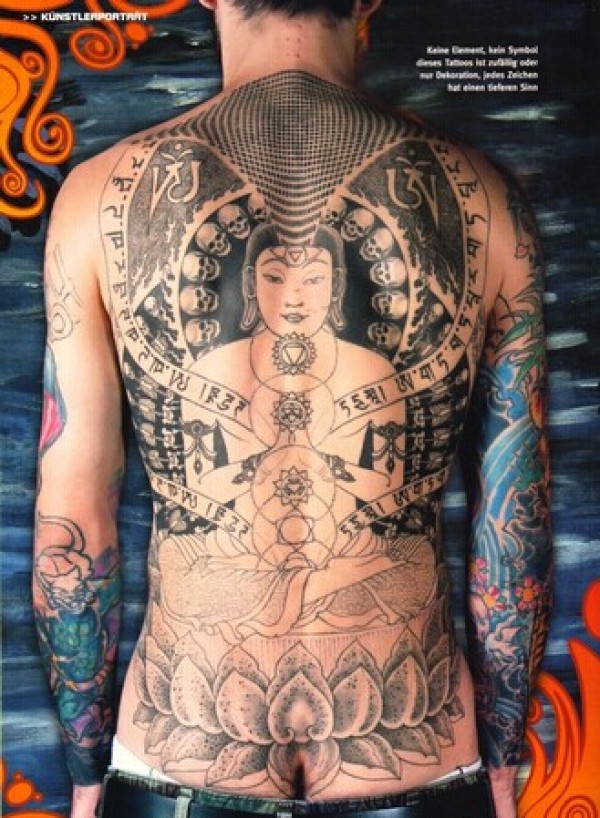 男生后背莲花坐上如来佛宗教纹身作品图片