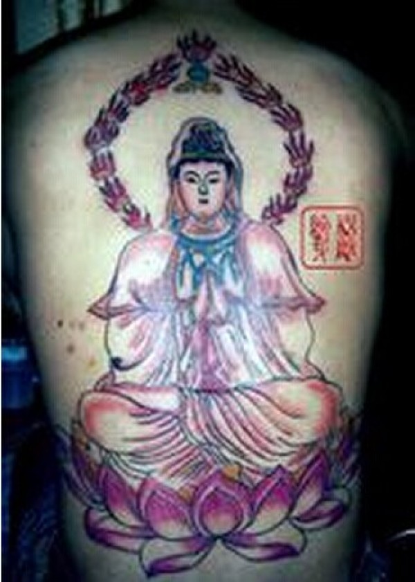 后背经典漂亮的观音坐莲花宗教纹身图图片
