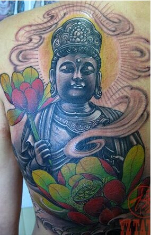 男生背部彩色观音莲花宗教纹身作品图片
