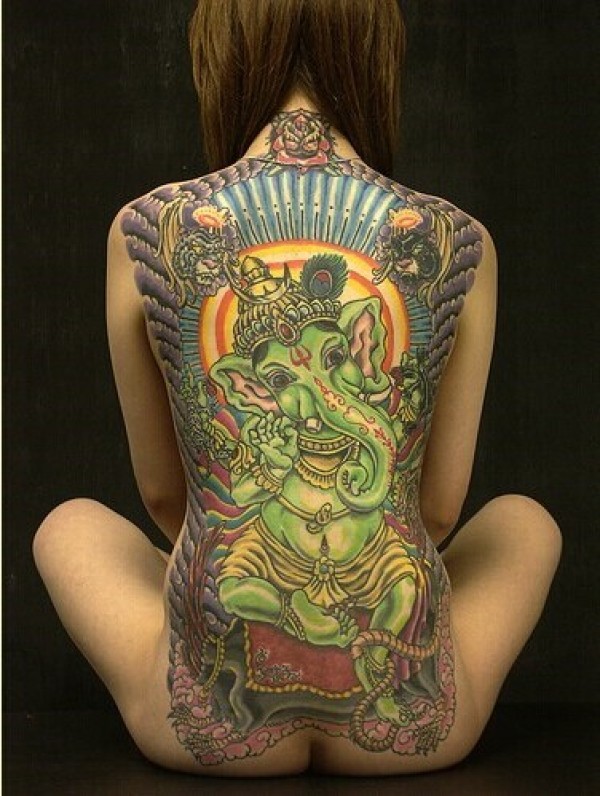 个性时尚女生满背象神纹身图案