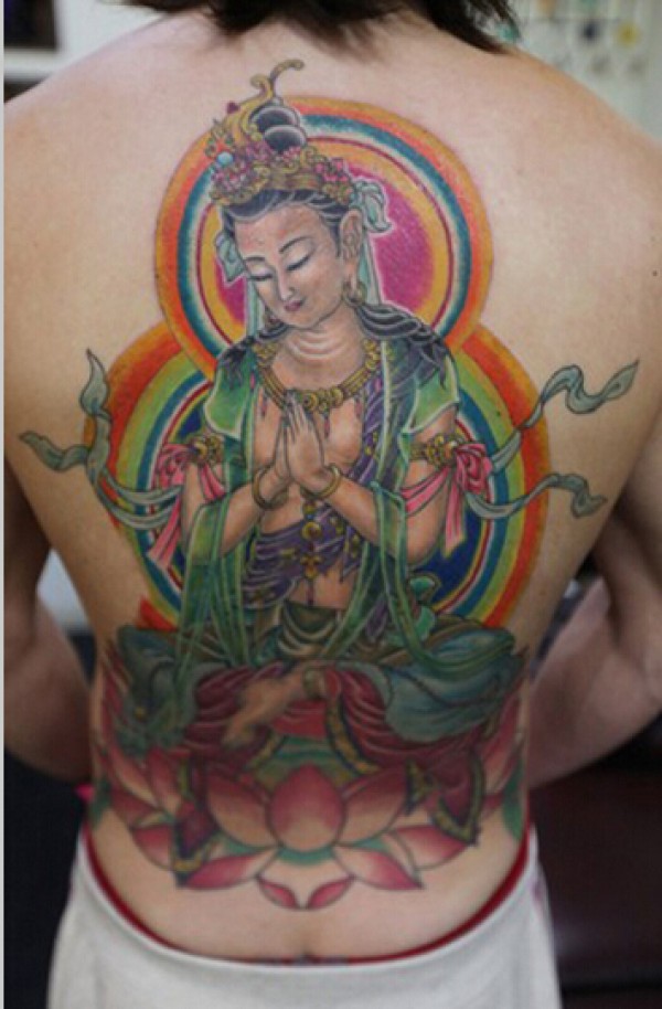 时尚个性后背部坐在莲花上的菩萨纹身图片