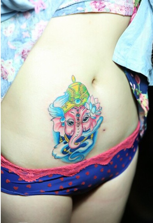 美女腹部疤痕遮盖可爱好看的象神纹身图片