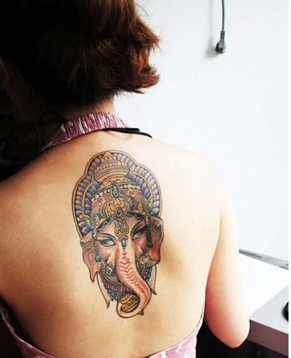 女生背部个性时尚象神纹身图案 图片