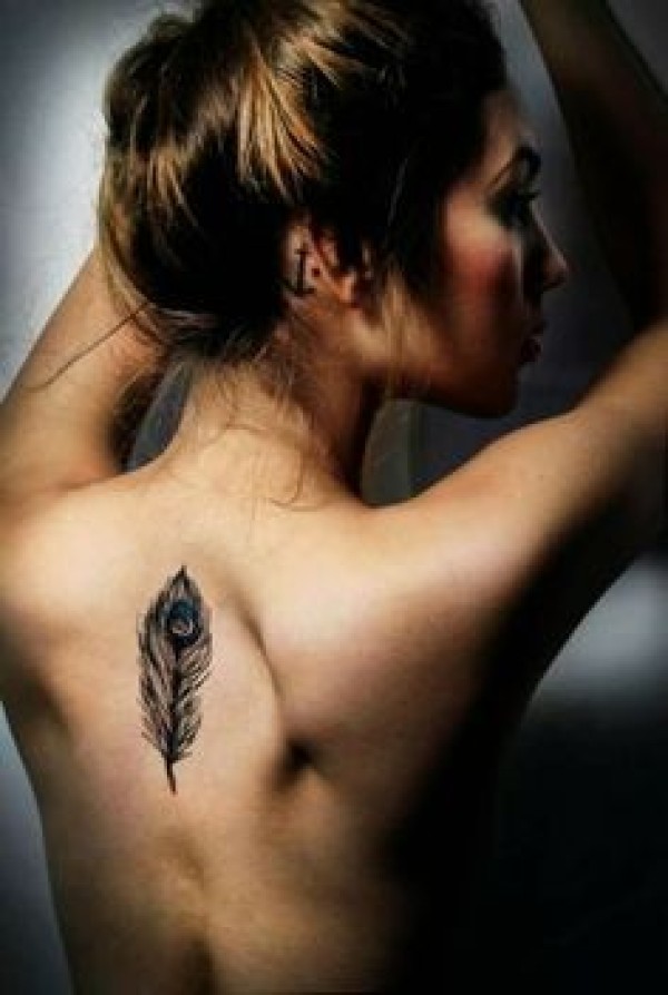 女生背部唯美漂亮的羽毛纹身