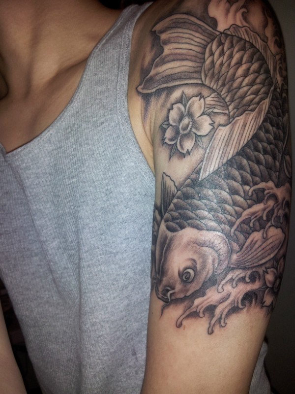 手臂上一款黑白色鲤鱼纹身