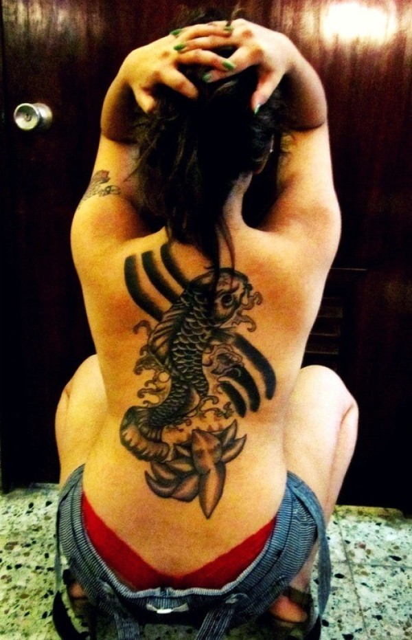 女生背部一条霸气的鲤鱼纹身