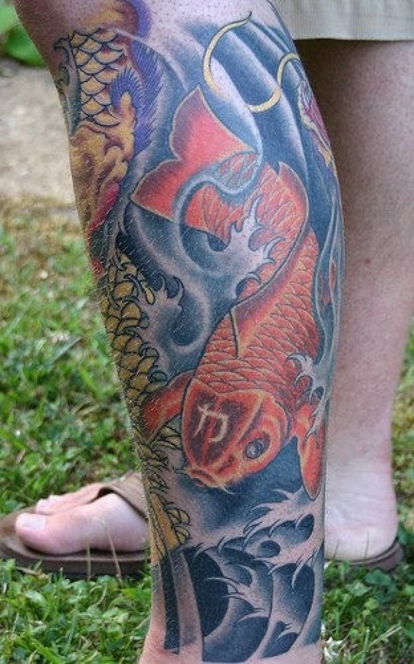 传统鲤鱼花小腿纹身_腿部纹身图案大全_纹身图吧