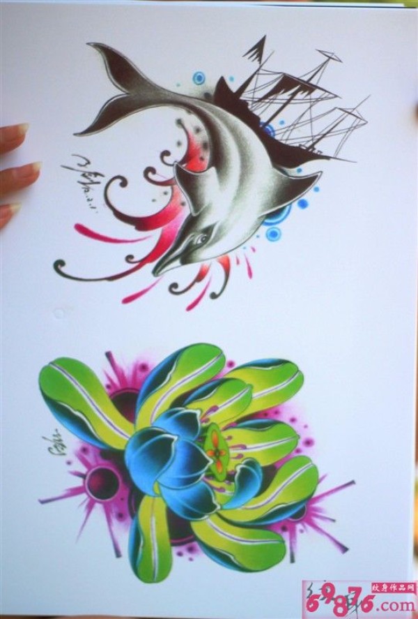 海豚莲花纹身手稿图片