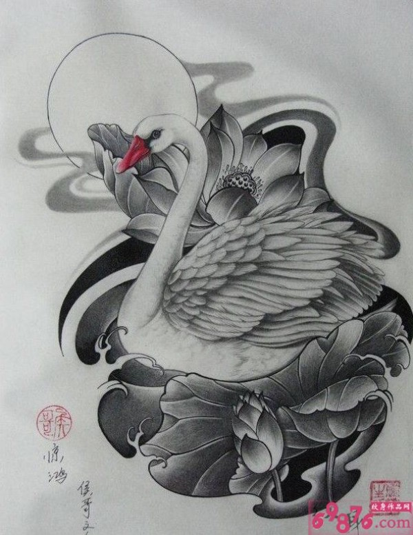 天鹅荷花纹身手稿图片