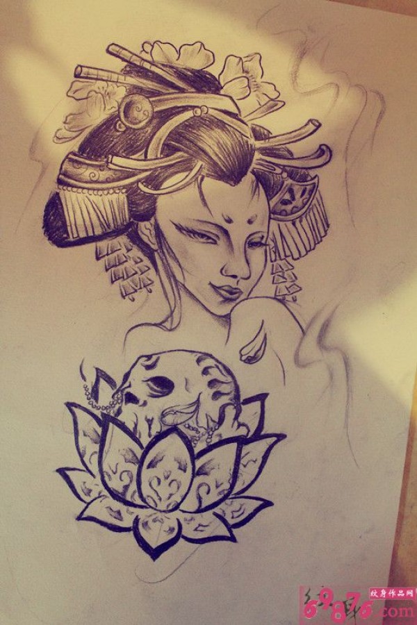 艺妓美女莲花骷髅纹身手稿图片