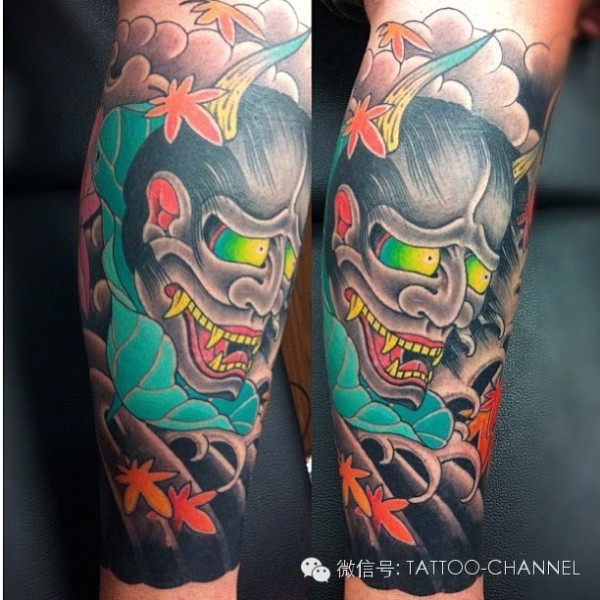 腿部帅气的般若小花腿纹身