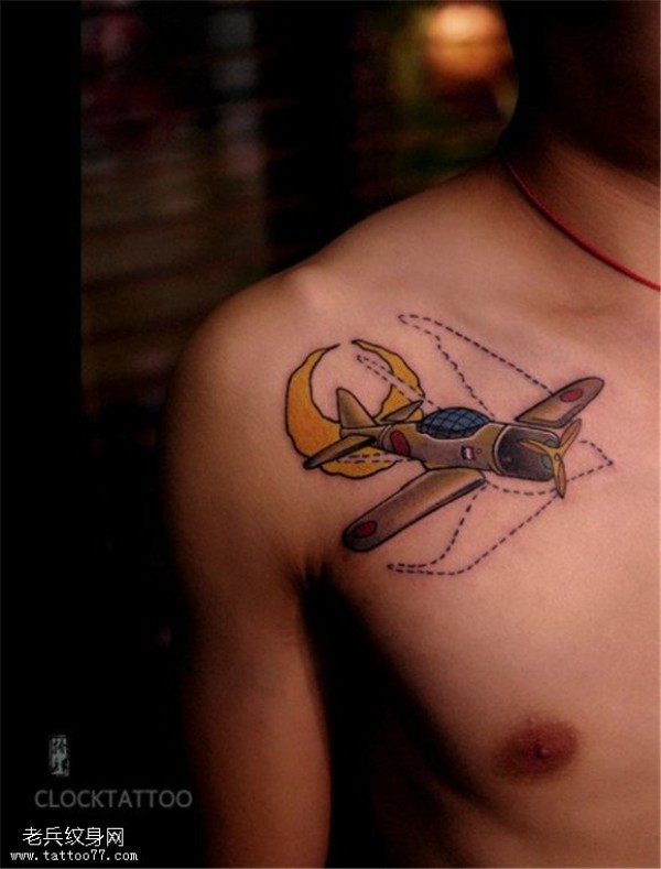 胸口彩色个性飞机纹身图案