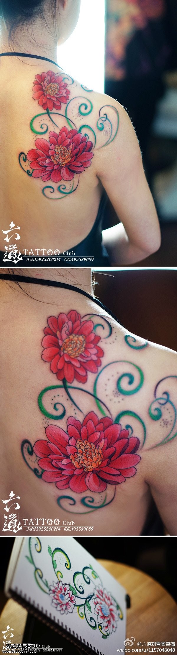 女生肩花纹身_15张女性双肩对称的肩花纹身图案作品图片