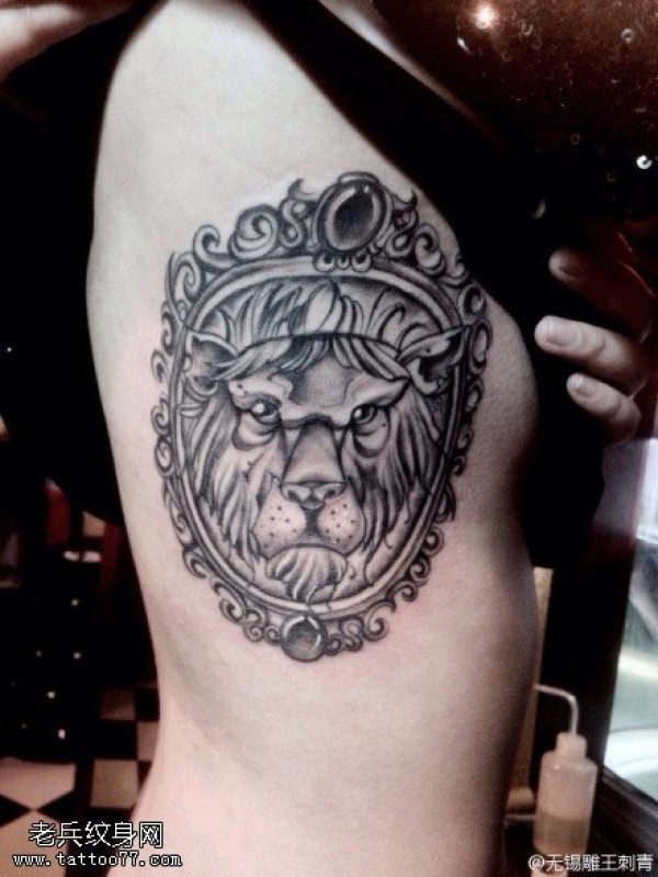 侧腰黑灰狮子纹身图案