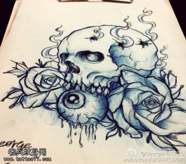 黑灰素描骷髅玫瑰花纹身手稿图片