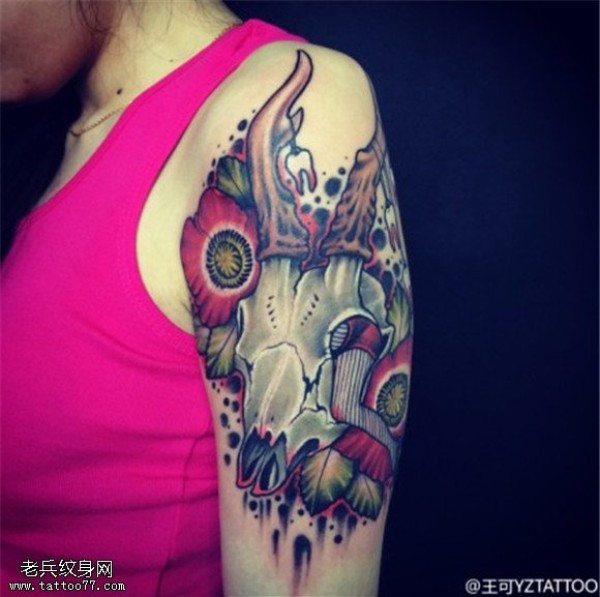 女生手臂彩色羚羊骷髅纹身图片