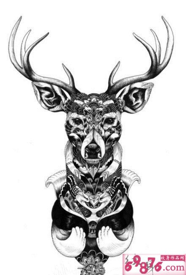 鹿黑白复古纹身稿图片