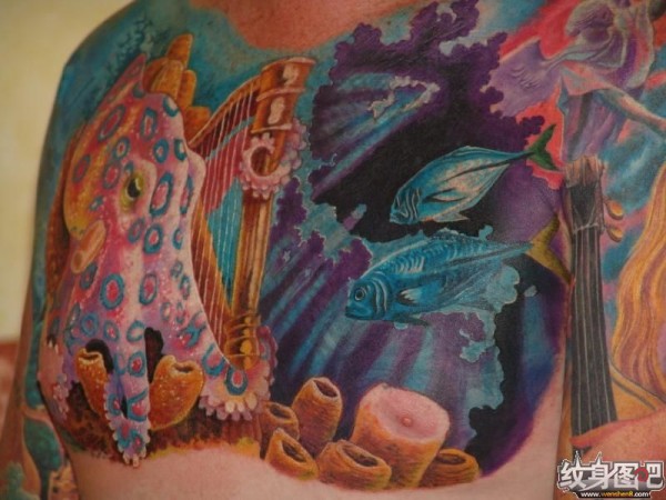 章鱼和竖琴,海洋主题胸前和后背纹身