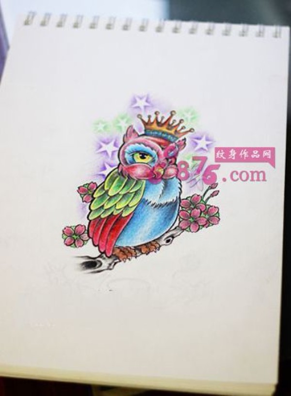 彩色皇冠猫头鹰纹身手稿图片