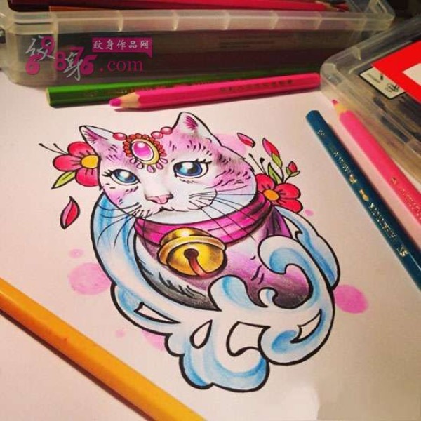 彩色招桃花猫咪纹身手稿图片