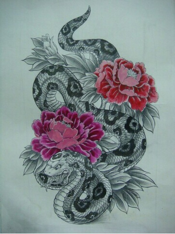 分享一款男生霸气鲜花毒蛇纹身手稿图图片