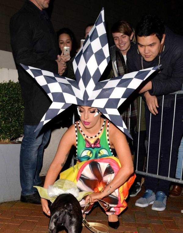 Lady Gaga着外星人图案连衣裤戴夸张头饰秀新纹身
