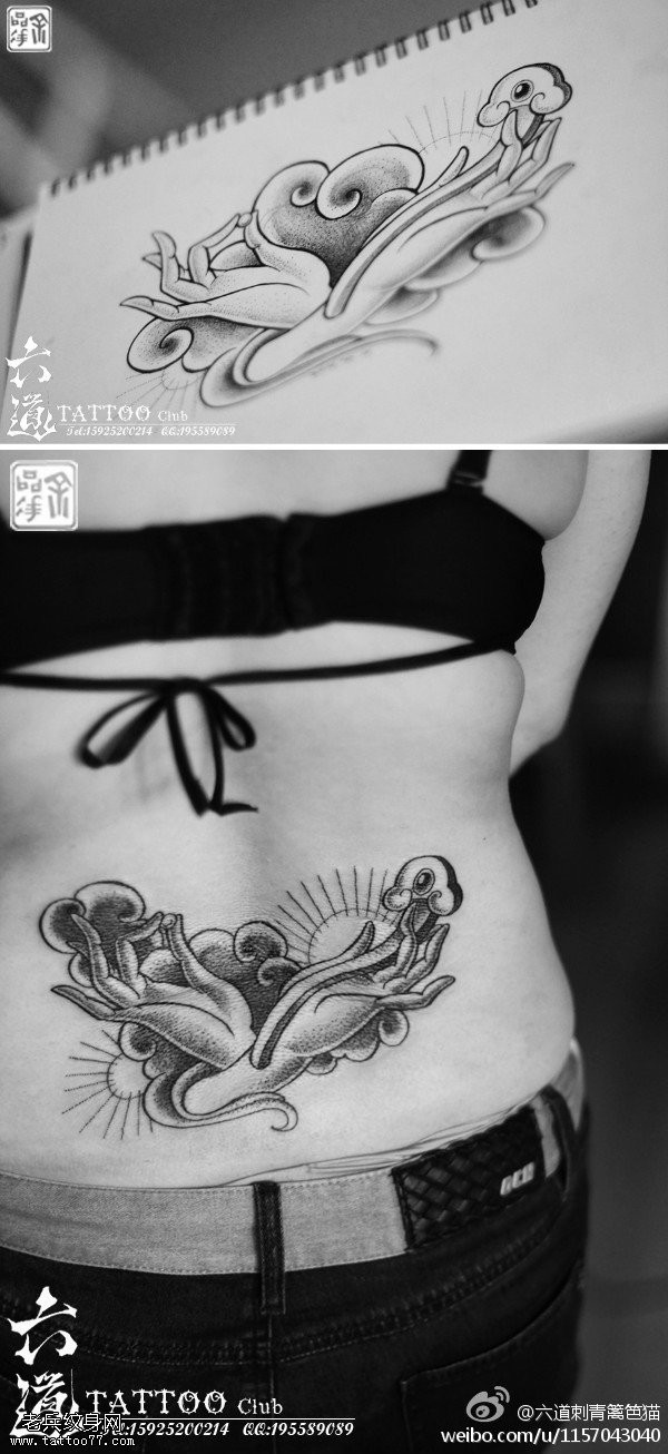 祥云环绕双手捻珠如意纹身图案