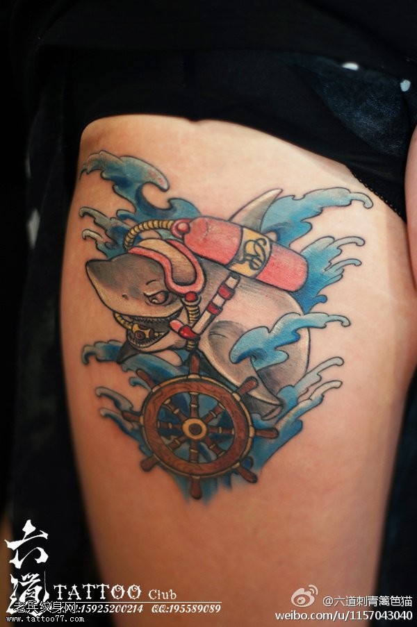 水彩水波方向盘小鲨鱼纹身图案