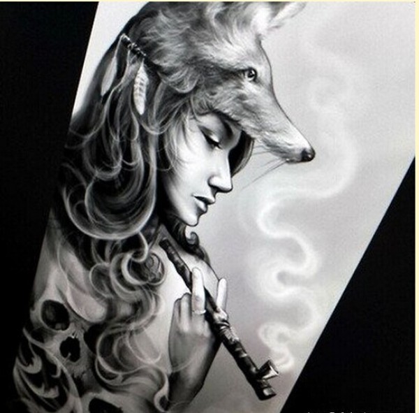 一款霸气狼女纹身手稿图案