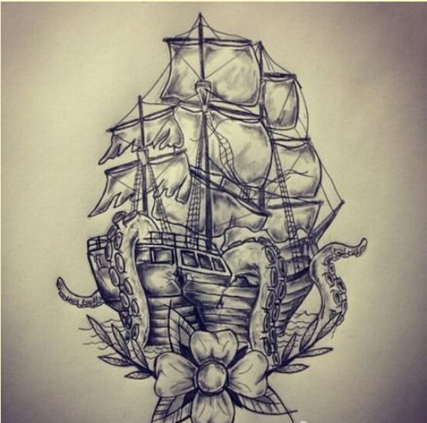 时尚漂亮帆船章鱼花纹身手稿图片图片