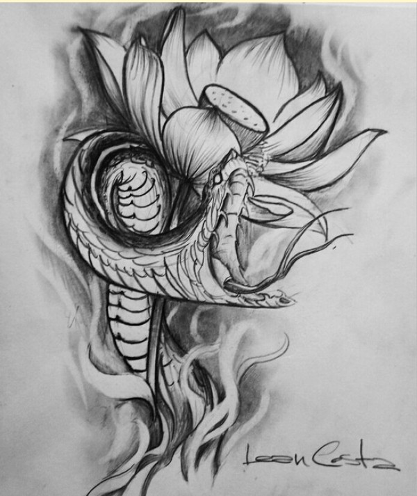 时尚好看的黑灰蛇莲花纹身手稿