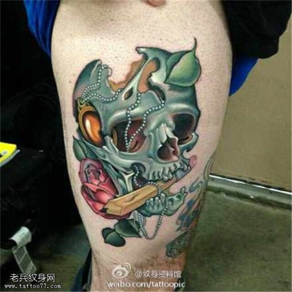 腿部欧美彩色骷髅玫瑰纹身图片