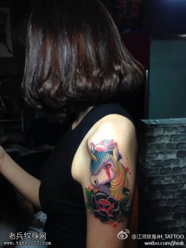 女生手臂彩色独角兽玫瑰纹身图案