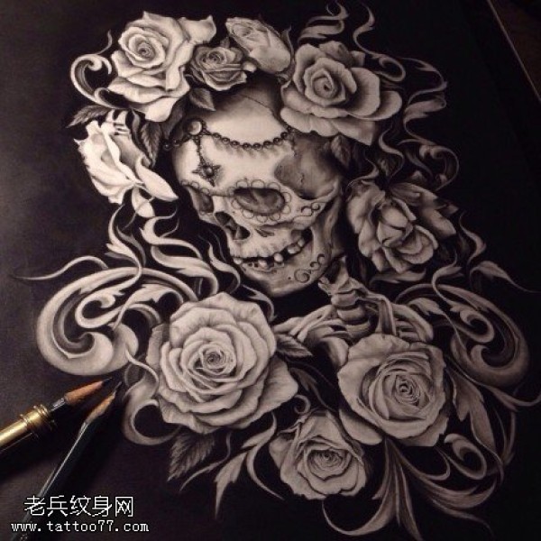 欧美黑灰骷髅头玫瑰花纹身手稿图片