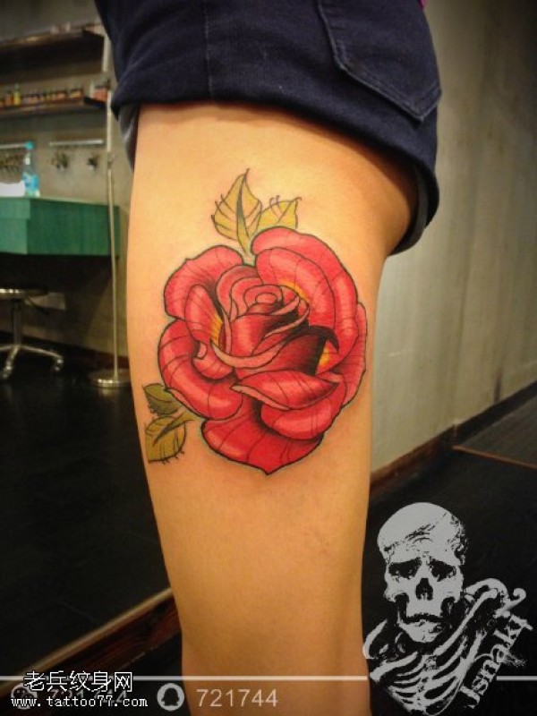 腿部彩色玫瑰花纹身图片