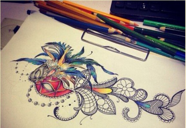 漂亮好看的面具蕾丝边羽毛纹身手稿图图片
