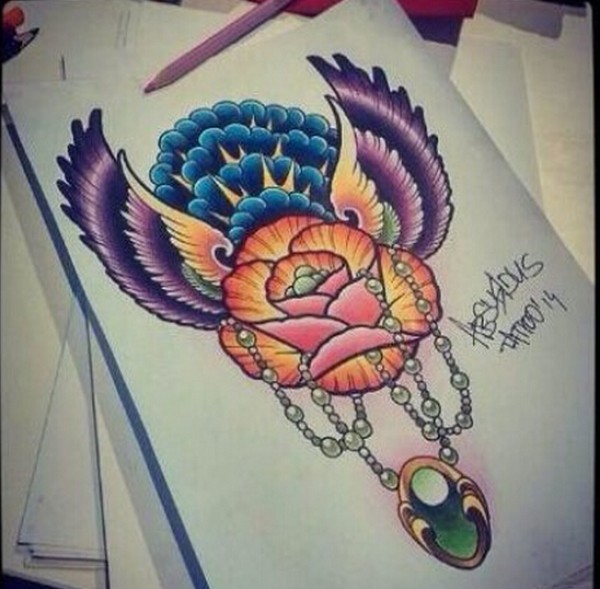 漂亮好看的彩色玫瑰花翅膀钻石纹身手图片