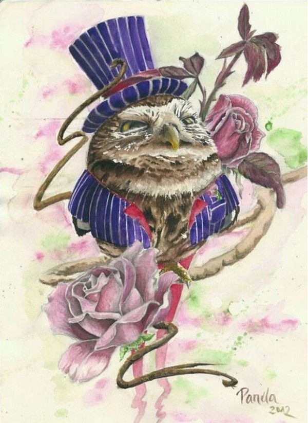 经典时尚好看的猫头鹰玫瑰花纹身手稿图片
