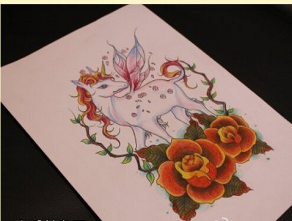 时尚好看的彩色玫瑰花鹿纹身手稿图案