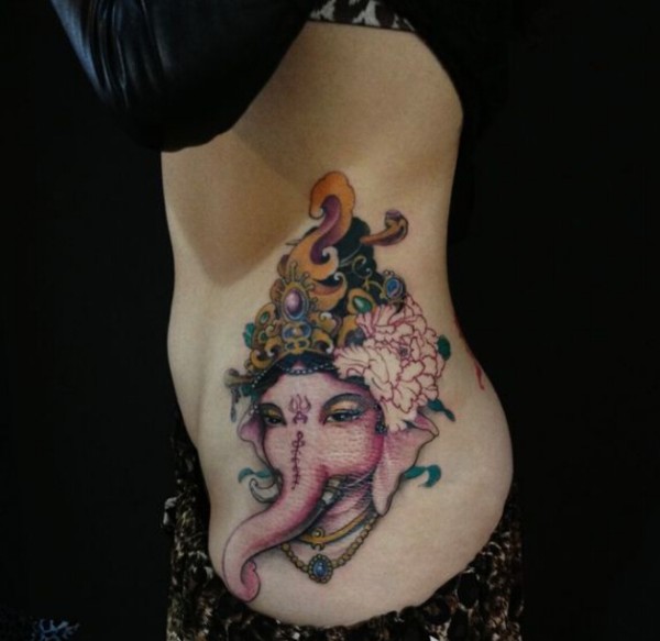 美女侧腰部唯美时尚好看的象神纹身图图片