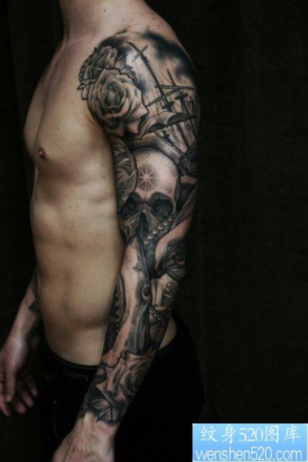 纹身图吧提供一款黑灰欧美花臂纹身图案