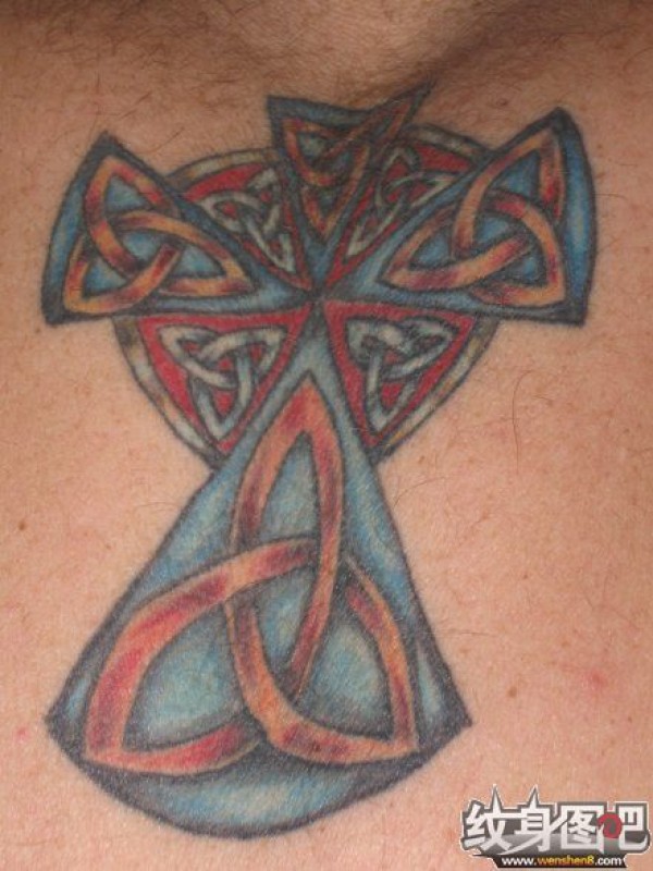蓝色底子红色纹饰十字架样子的图腾纹身