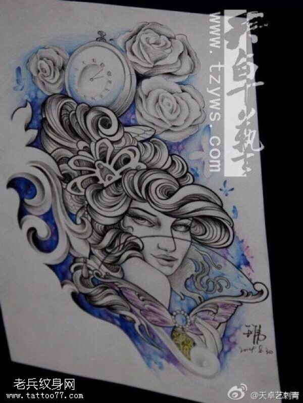 女郎玫瑰时钟纹身手稿图片