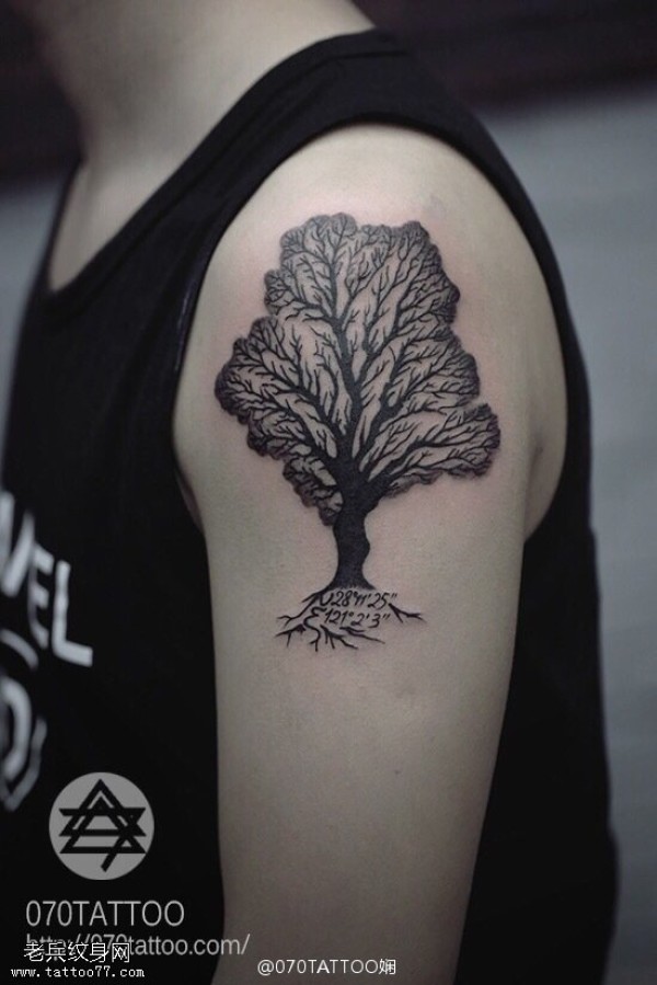 胳膊点刺纯色生命树纹身图案