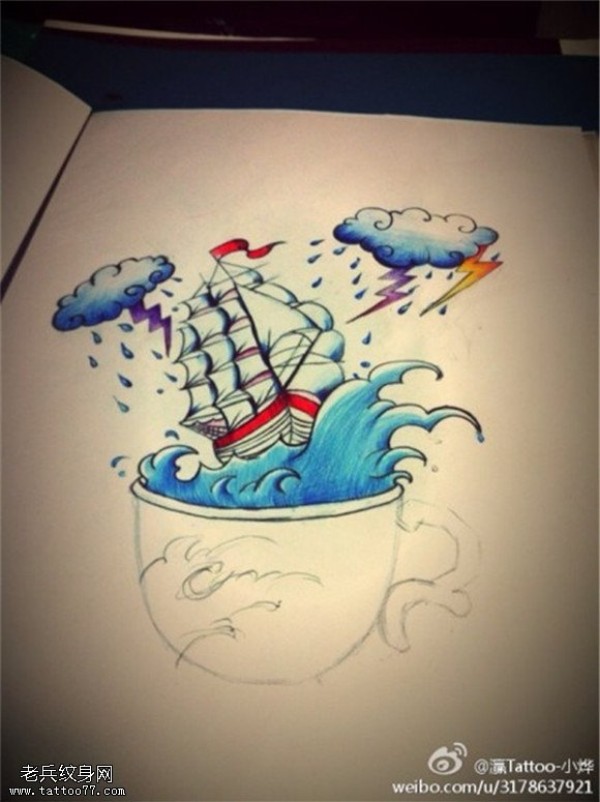 帆船闪电云纹身手稿图片