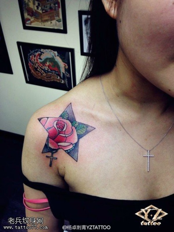 女生肩部彩色五角星玫瑰纹身图案